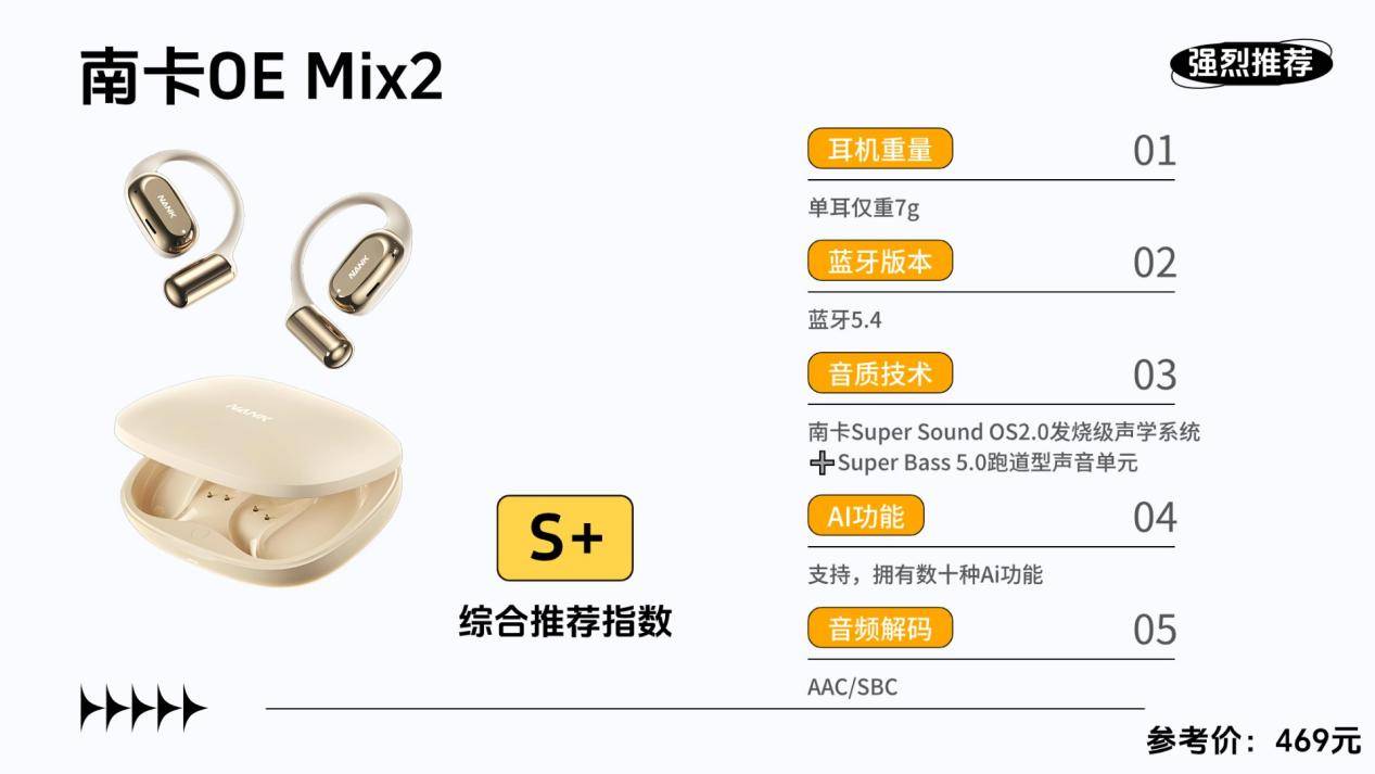 南卡OE Mix2凭借顶级硬件和独创Super Bass 5.0跑道型高性能声音单元、OS 2.0发烧级声学系统、6+3维传感空间音频,以及高定制蓝牙5.4芯片SOC等,提供超越常规的佩戴舒适体验以及音质表现,成为了众多耳机发烧友和专业用户的首选!南卡OE Mix2不追求花哨的外观设计,而是专注追求实际音质性能,凭借其极致的表现,不仅在国内获得市政府强力推荐外,还相继登上德国红点、缪思设计奖顶端。在开放式耳机的技术实力方面的优势是毋庸置疑的。