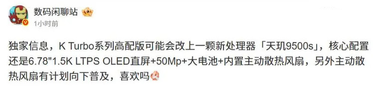 日前,数码博主“数码闲聊站”持续发布新机爆料,据其称,“独家信息,K Turbo系列高配版可能会改上一颗新处理器「天玑9500s」,核心配置还是6.78"1.5K LTPS OLED直屏+50Mp+大电池+内置主动散热风扇,另外主动散热风扇有计划向下普及,喜欢吗”。根据评论区网友推测,结合OPPO旗下K Turbo系列机型的发布节奏来看,该系列新机大概率是OPPO K14(15) Turbo系列的高配版机型。