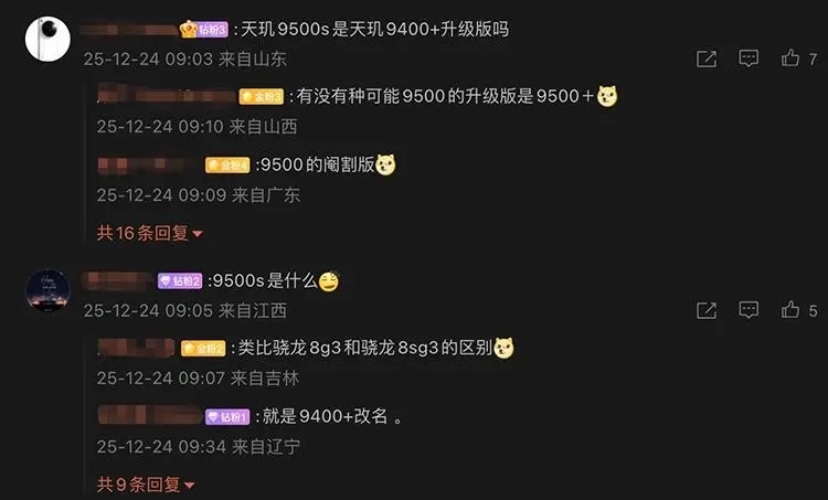 此外,针对评论区网友提出的“是否有其他新机配备10000mAh电池?”的问题,该博主回应称:“蒽,目前没有看到第二家性能机上10000。”针对小米17 Ultra徕卡版有什么升级的问题,该博主回应称,:“一些影像花活儿,普通版也是硬件不支持。”至于这个9500s,此前没有带s后缀的先例,不过有网友认为它其实就是“small”的意思,八成就是9500e又换了名,用来看齐高通骁龙家的s。