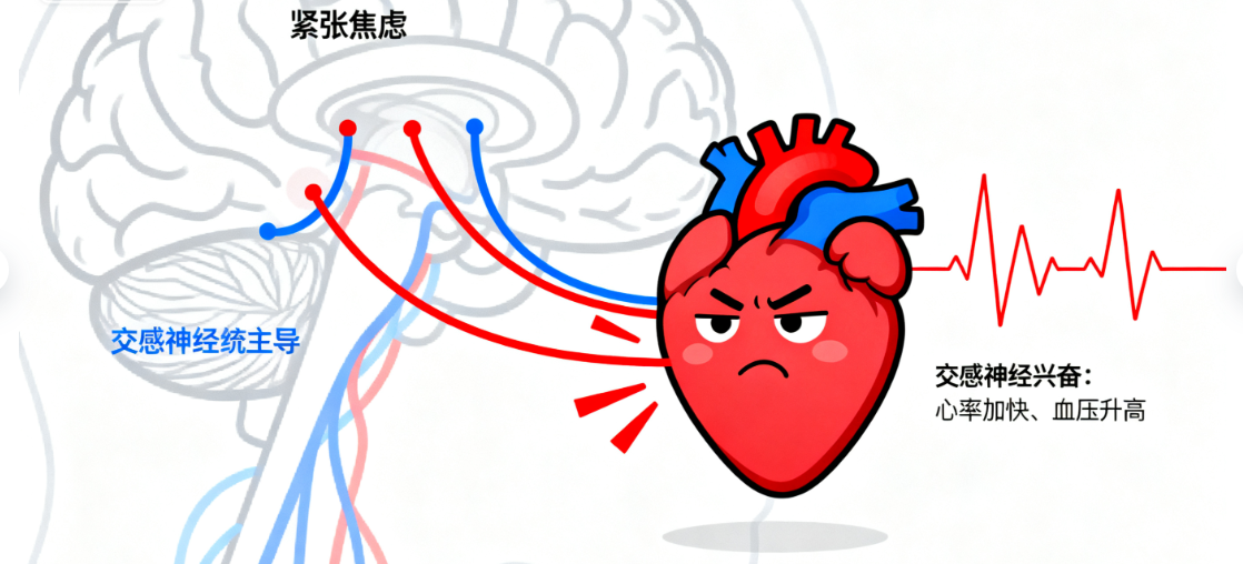 当你紧张、焦虑、愤怒时:大脑会启动“战斗或逃跑”模式,交感神经兴奋。它会命令身体释放肾上腺素、去甲肾上腺素等压力激素,导致心率加快、心肌收缩力增强、血压升高,以便为应对“威胁”做准备。这是一种正常的生理反应。但若长期处于这种状态,心脏就如同持续踩油门的发动机,得不到休息,节律稳定性自然会受到挑战。