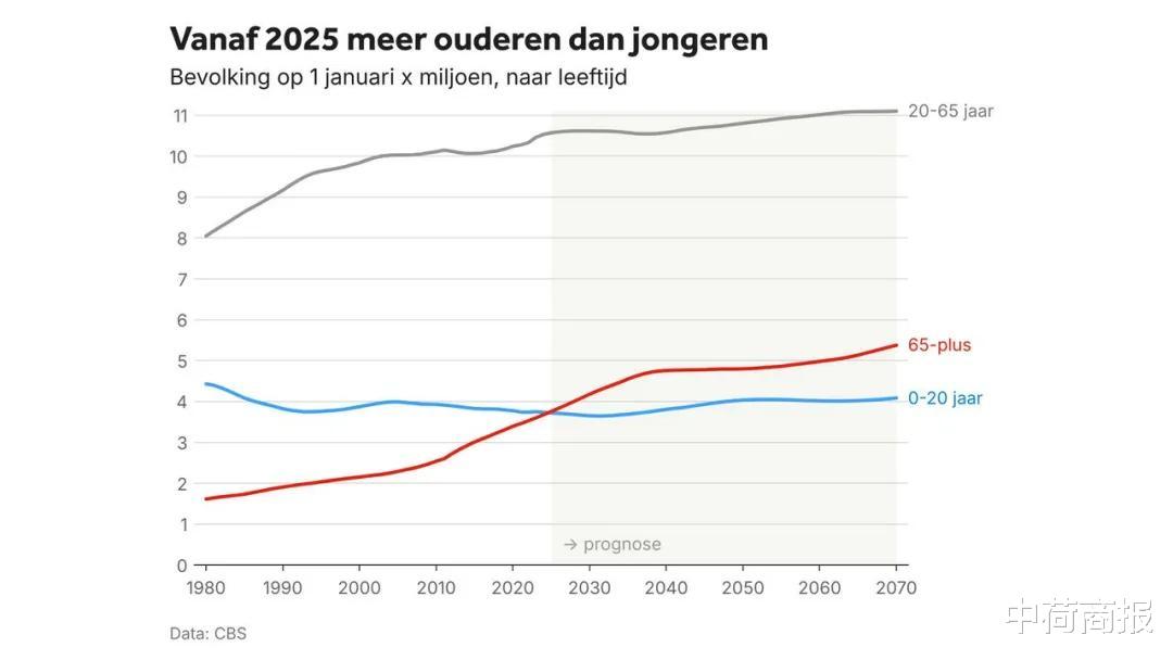 据荷兰中央统计局(CBS)消息,荷兰65岁及以上人口数量首次超过20岁以下的年轻人口。今年年初,荷兰共有372万名青年,而65岁及以上老年人数量为376万。CBS预计,未来几十年这一差距还将进一步扩大。