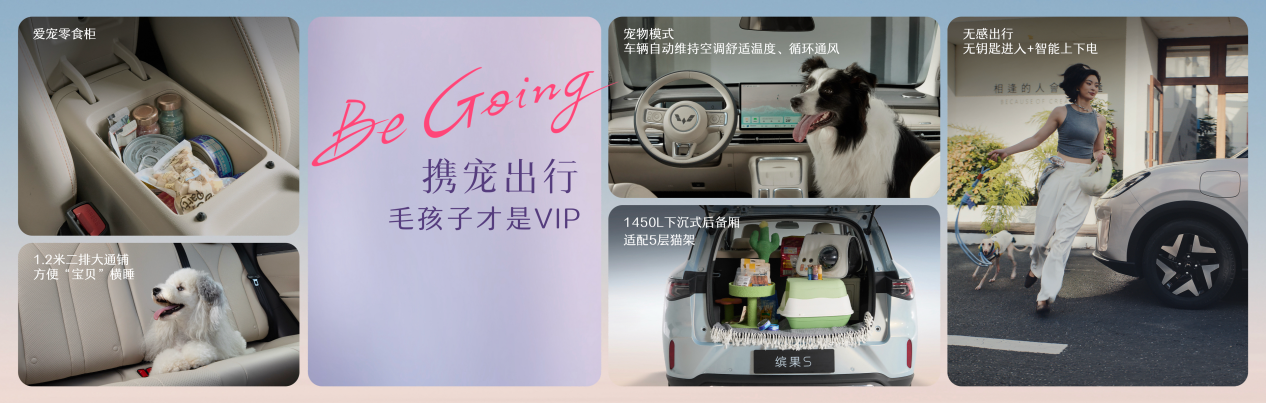 用户携宠出行时,缤果S标配的无感进入功能让用户在抱着宠物的情况下也能够轻松上下车;同级领先的宠物模式实现车辆自动维持空调舒适温度、循环通风,用户离车时宠物在车里依旧安全惬意。车内空间宽适,二排1.2米大通铺让爱宠肆意横躺;多处储物空间,方便宠物用品及零食分类收纳、随用随取;1450L超大后备厢更可轻松容纳五层猫爬架,多宠家庭出行亦从容有序。