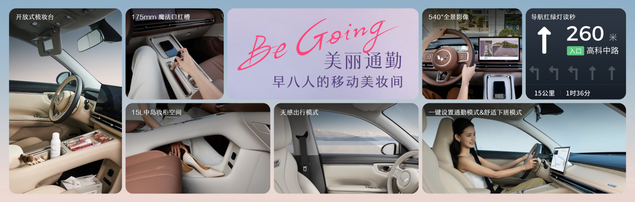 针对职场女性的通勤场景,缤果S贴心打造兼具美感与松弛感的移动空间。上车系好安全带,车辆自动开启空调及预设的通勤导航,直达公司;下班一键切换舒适回家模式,空调与回家路线同步就绪,红绿灯读秒、540°全景影像让行车停车得心应手。贴心的开放式补妆梳妆台、175mm专属口红槽、化妆镜与补光灯等,通勤路上随时保持精致状态。15L中岛妆柜巧妙设计分层空间,包包、高跟鞋都能轻松收纳。
