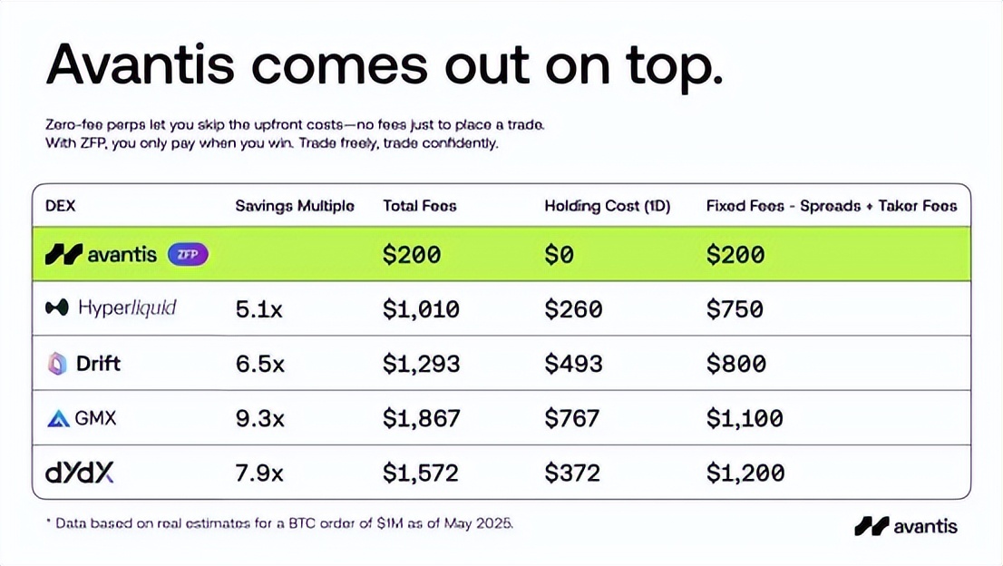 成本结构彻底颠覆: 这张对比图很说明问题。基于 2025 年 5 月 100 万美元的 BTC 订单测算,Avantis 的综合费用显著低于其他主流 DEX。