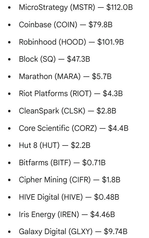 我说的是像 MicroStrategy (MSTR)、Coinbase (COIN)、Robinhood (HOOD) 以及各大上市矿企。这些公司的股价与加密市场高度相关,甚至往往是更高 Beta 的放大器。