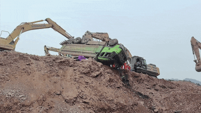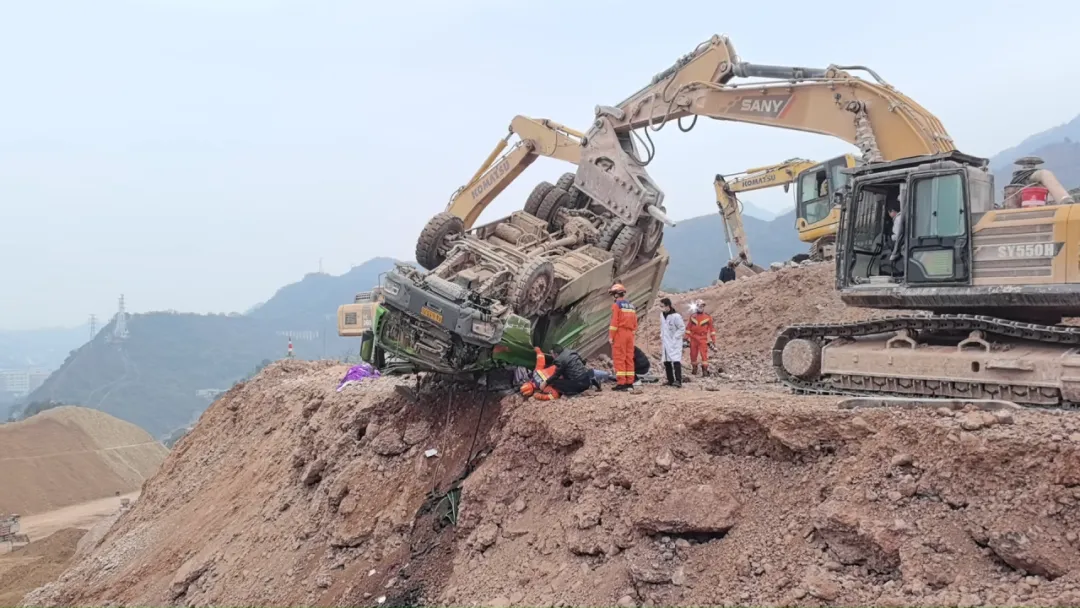 发现一辆货车完全仰翻在工地路坎边缘