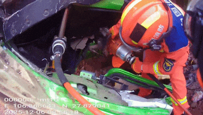 从另一侧潜入严重变形的驾驶室内部