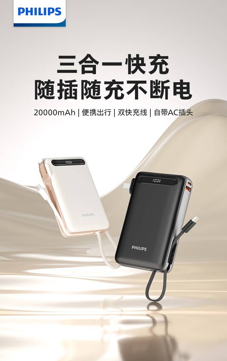 这款充电宝电池容量为 20000mAh,额定容量 11600mAh,额定能量为77Wh,电池容量可满足手机 3-4 次满电补充,也能支撑手机、平板、耳机等多设备协同续航,适合长途旅行、户外作业等重度用电的场景。它自带Type-C和苹果线,挂绳式自带线可拎着出门;配备两个接口,支持多设备同时充电。侧面AC插口可拉出插墙作充电器,能解决线材收纳难题,适配苹果、华为等多品牌设备。它支持22.5W超级快充 20W苹果快充,兼容 PD3.0 等主流快充协议,能实现不同设备快速充电,高效又省时。