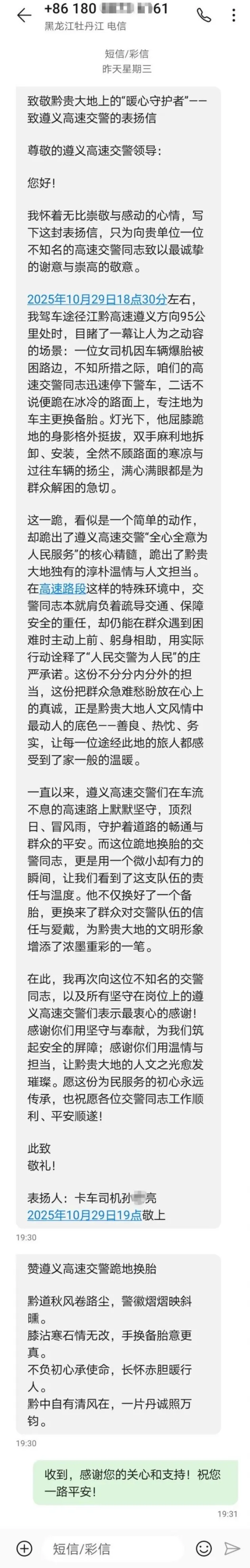这看似平常的救援画面,深深打动了恰巧路过的货车司机孙先生。透过车窗,他目睹了交警俯身在冰冷路面上专注换胎的全过程。深受感动的孙先生特意记下警车编号,随后创作了一封情真意切的表扬信和一首赞美诗,发送至高速三大队。
