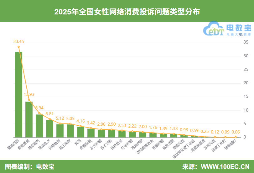 据“电诉宝”显示,2025年全国女性网购消费投诉问题类型TOP10为:退款问题(33.45%)、商品质量(13.93%)、售后服务(8.94%)、网络欺诈(6.81%)、网络售假(5.12%)、霸王条款(5.05%)、虚假促销(3.42%)、发货问题(2.96%)、货不对板(2.90%)、退换货难(2.53%)。