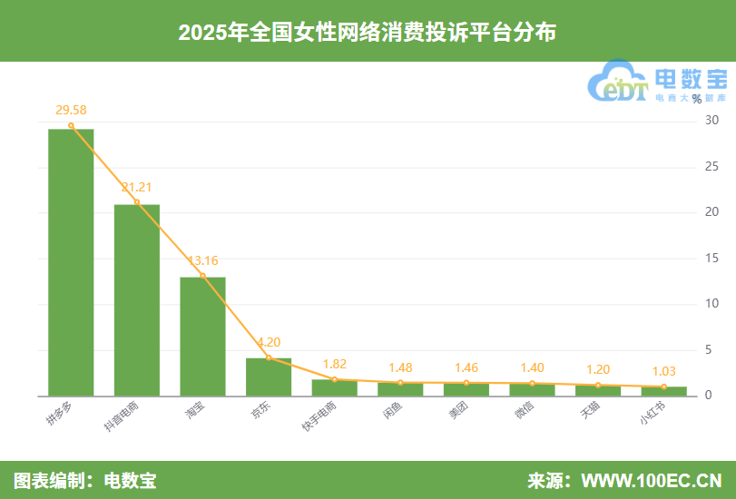 据“电诉宝”显示,电商平台按女性投诉量占比排在TOP10的分别是:拼多多(29.58%)、抖音电商(21.21%)、淘宝(13.16%)、京东(4.20%)、快手电商(1.82%)、闲鱼(1.48%)、美团(1.46%)、微信(1.40%)、天猫(1.20%)、小红书(1.03%)。