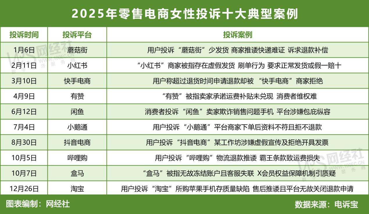 2025年女性网购在零售电商领域中,据“电诉宝”受理用户维权案例,我们从中选取十大典型投诉案例,涉及蘑菇街、小红书、快手电商、有赞、花礼网、闲鱼、小鹅通、抖音电商、哔哩购、盒马。