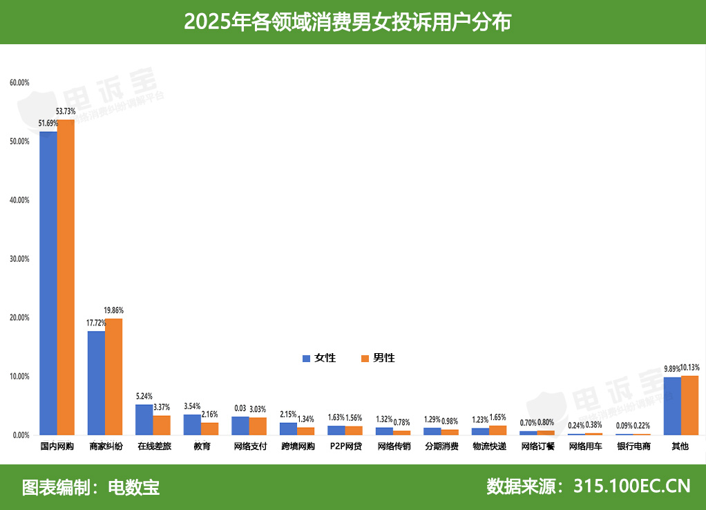 据国内网络消费调解平台“电诉宝”受理用户维权案例显示,2025年全年网络消费投诉用户性别占比分别为男性(75.33%)、女性(24.67%),女性用户占比同比2024年下降6.69%。
