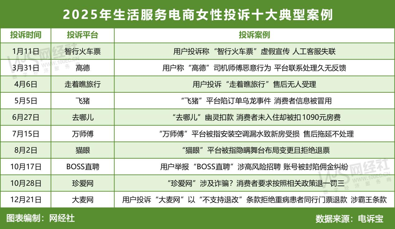 2025年女性网购在生活服务电商领域中,据“电诉宝”受理用户维权案例,我们从中选取十大典型投诉案例,涉及智行火车票、高德、走着瞧旅行、飞猪、去哪儿、万师傅、猫眼、BOSS直聘、珍爱网、大麦网。