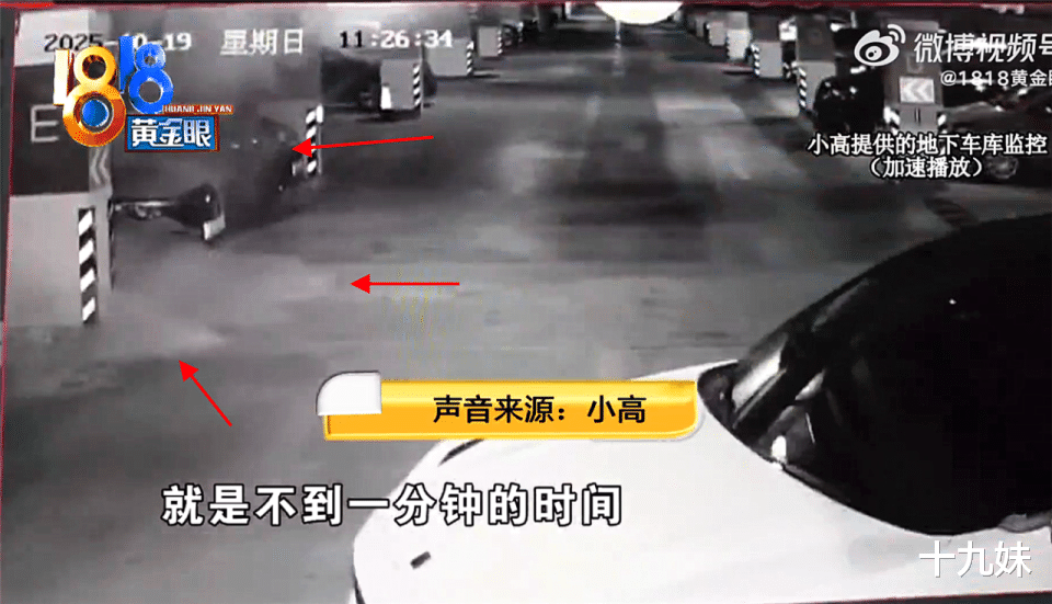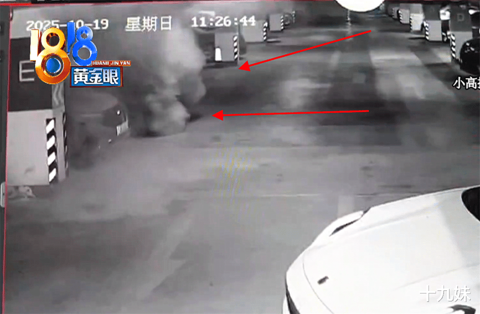 从地下车库的监控视频中能看到,10月19日上午11:26分,他的奔驰EQE在车位上正常停放。在没有发生任何碰撞,也没有任何人靠近的情况下,车头处竟突然冒出大量白烟。