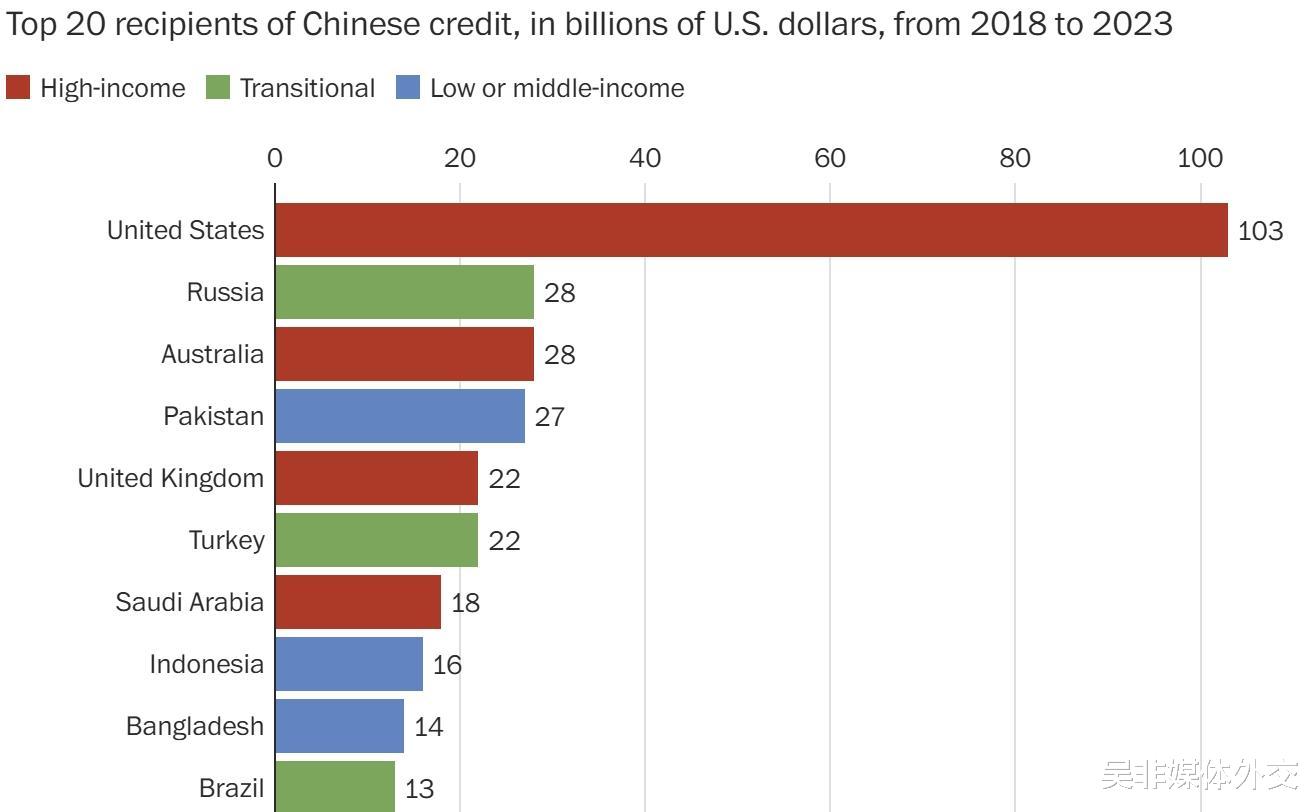 《华盛顿邮报》做的图表更直观:过去几年间,中国信贷的前十大获得者里,美国以103亿美元稳居第一,远超排名第二的俄罗斯和澳大利亚(各28亿美元)。