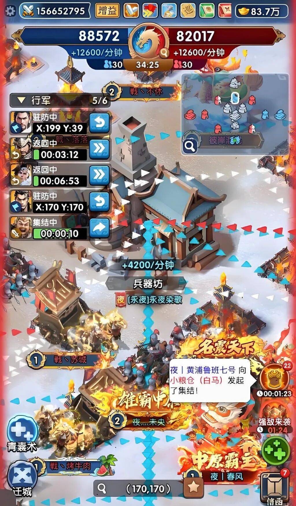 若势均力敌,就打 “分组占点战”:抢兵器坊、工匠坊,驻防多补兵,攻城开集结,派小股兵力骚扰敌方小点,牵制对手精力。