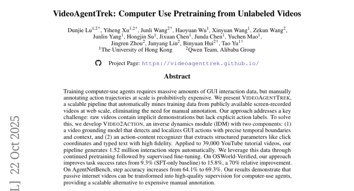 A:VideoAgentTrek是香港大学和阿里巴巴团队开发的AI训练系统,它能自动从YouTube教程视频中提取电脑操作信息,让AI学会使用电脑,就像人类通过看视频学习一样。