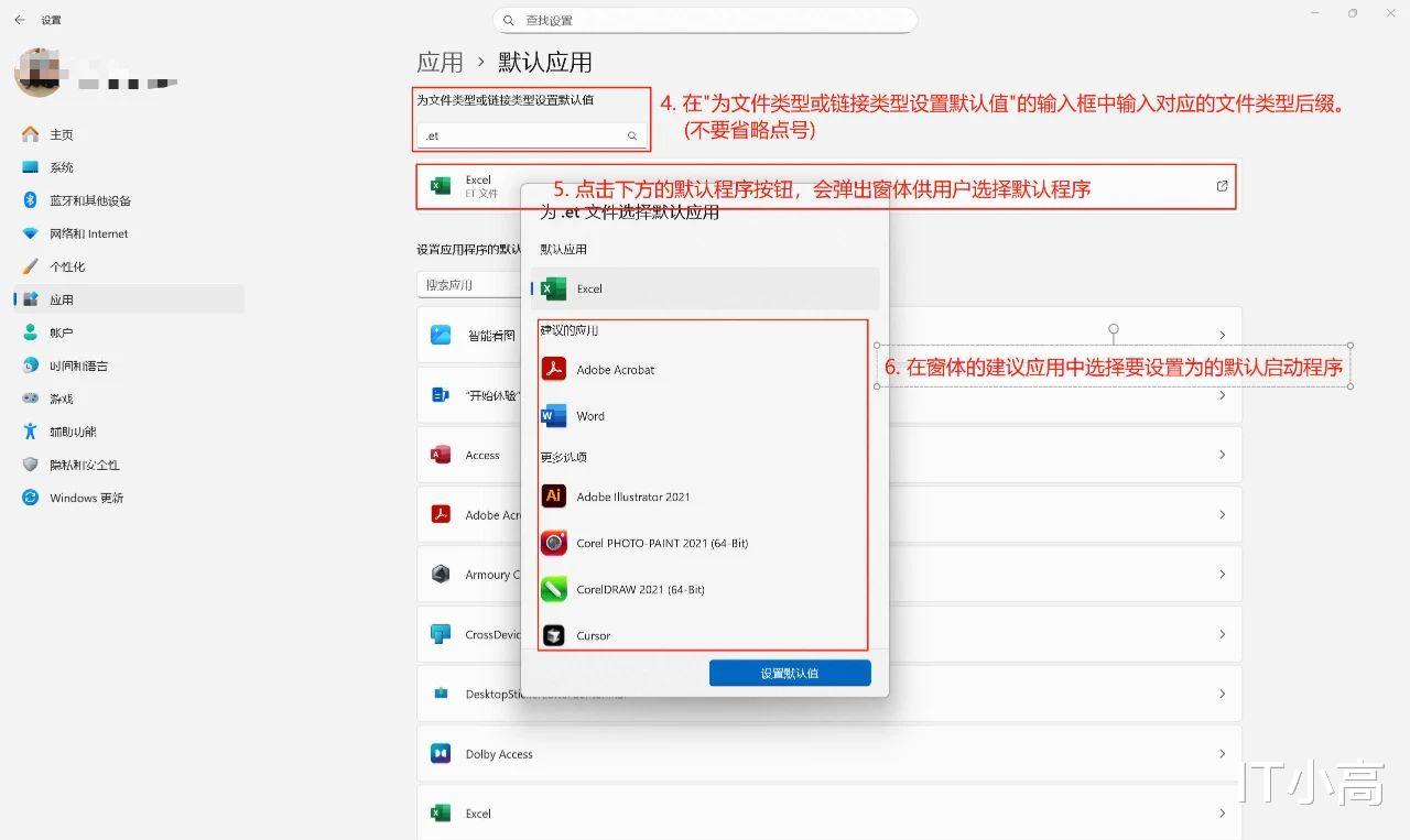 3. 选默认程序:点击下方"默认程序按钮",弹出窗选建议应用(如Excel),点"设置默认值"就完成。