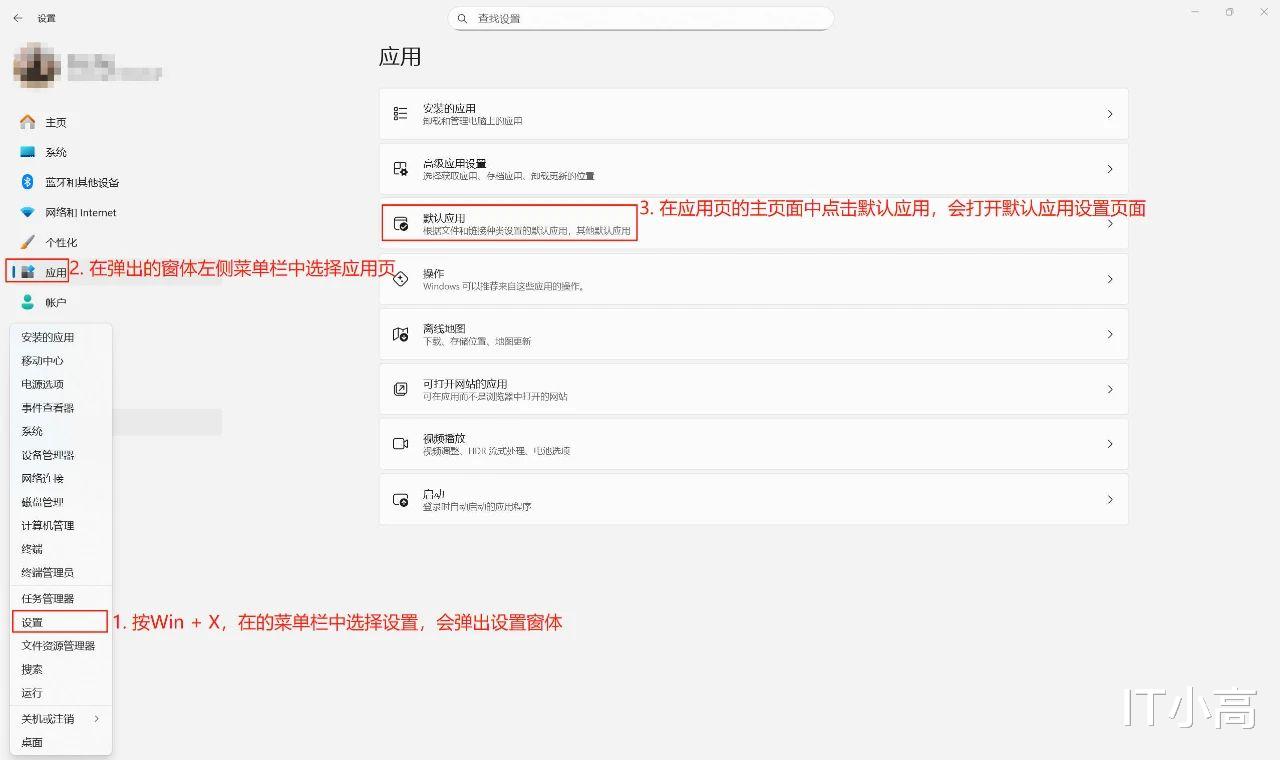 1. 进设置-应用:打开Win + X菜单,选"设置"→左侧栏点"应用"→主页点击"默认应用"。