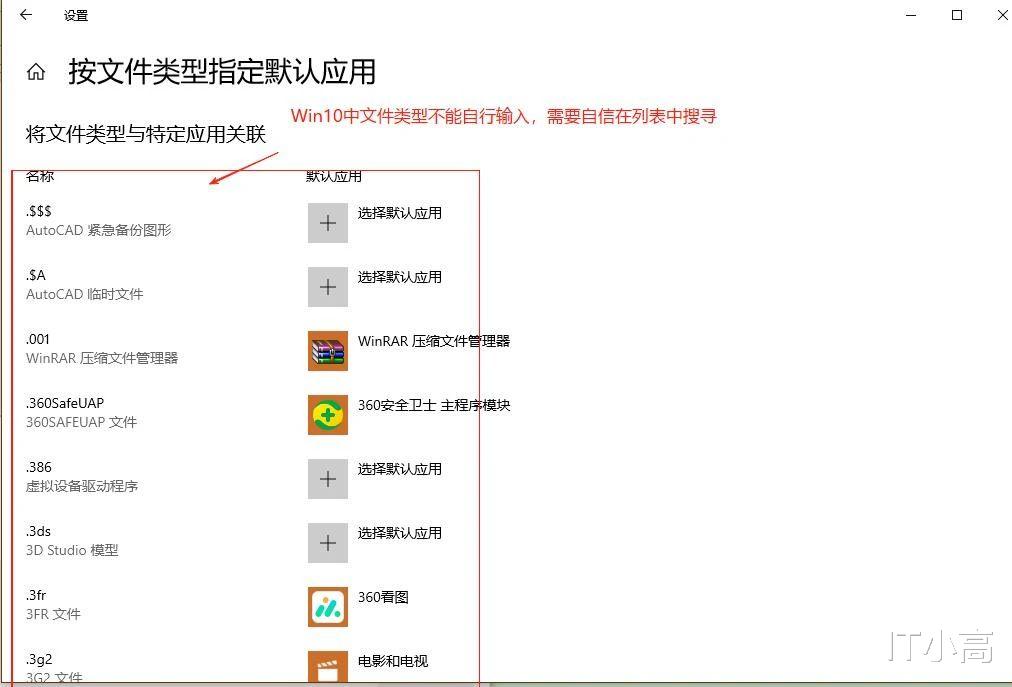 Win10设置位置不同,看图说明——"默认应用"页最下方才有"为文件类型设置..."链接。点开后需手动搜寻列表(麻烦!),如果找不到.et等冷门后缀,别急: