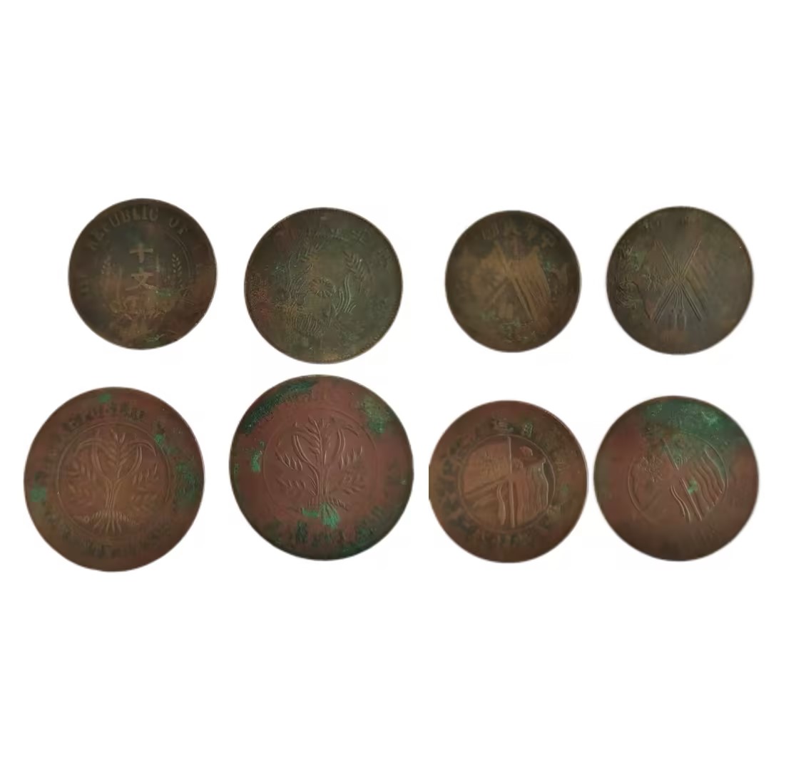 地方造币厂的博弈:因中央造币能力有限,各省造币厂(如河南、四川、湖南、江西)纷纷仿制双旗币,导致版别众多。图片中的四枚铜币,可能分别来自不同省份——如“河南造”版背面有“豫”字,“四川造”版有“川”字,体现了“中央统一”与“地方自主”的博弈。