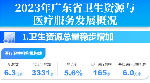 据近期发布的《广东省卫生资源与医疗服务发展概况》显示,2023年度广东省医疗卫生机构同比增加5.6%;在岗职工同比增长5.5%;而次均门诊费用、次均住院费用均有明显下降,该省医疗卫生事业总体上仍在稳定发展。