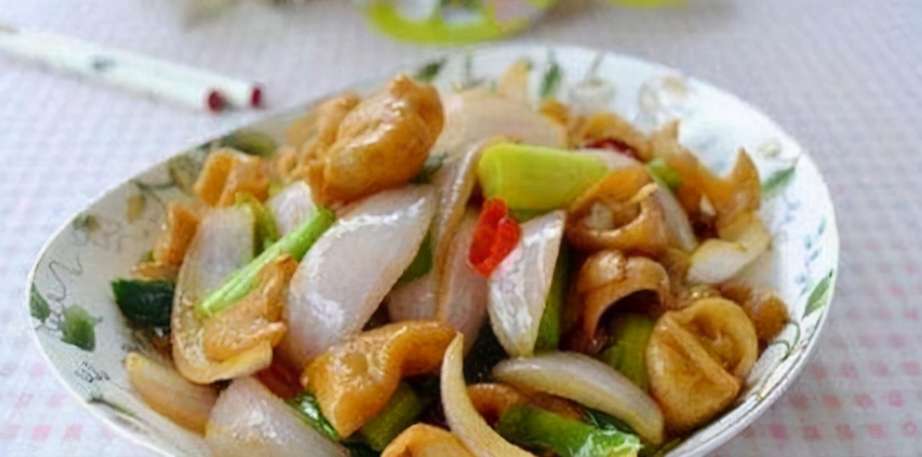 4、青椒洋葱炒软后下入肥肠大火爆炒,再加少许盐和酱油。