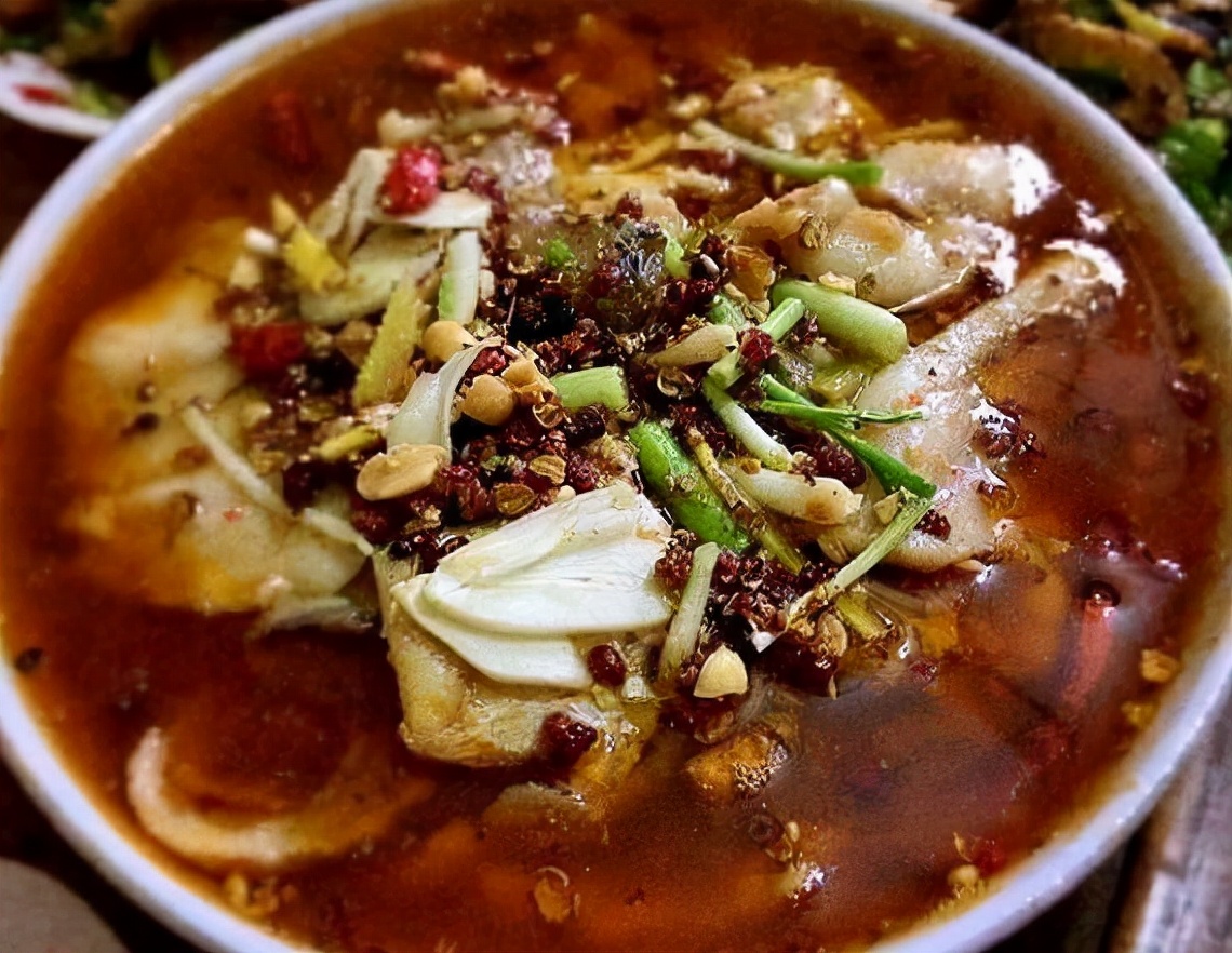 2.锅置旺火上,放入猪油烧至六成热时,放入姜末、蒜末炒香,再加入干七星椒、藤椒籽、辣椒面稍炒,随即倒入鲜汤3000克,加入鱼骨熬制5分钟捞出,然后放入码好味的鱼片焖烧3分钟,调入幺麻子藤椒油、味精和鸡精,盛盆,撒入藿香即成。