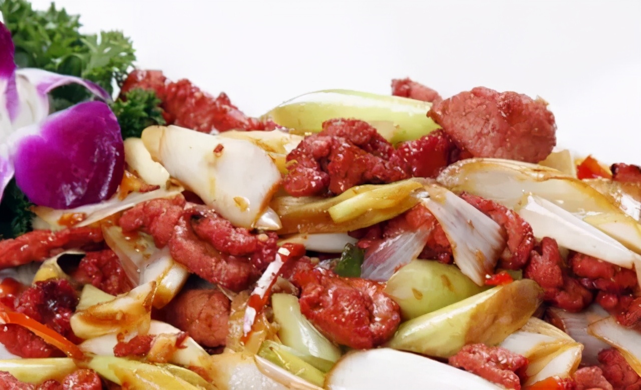 3、放入牛肉炒到九成熟,加入剩余的葱段、生抽、盐、鸡粉、白胡椒、香油翻炒,出锅。