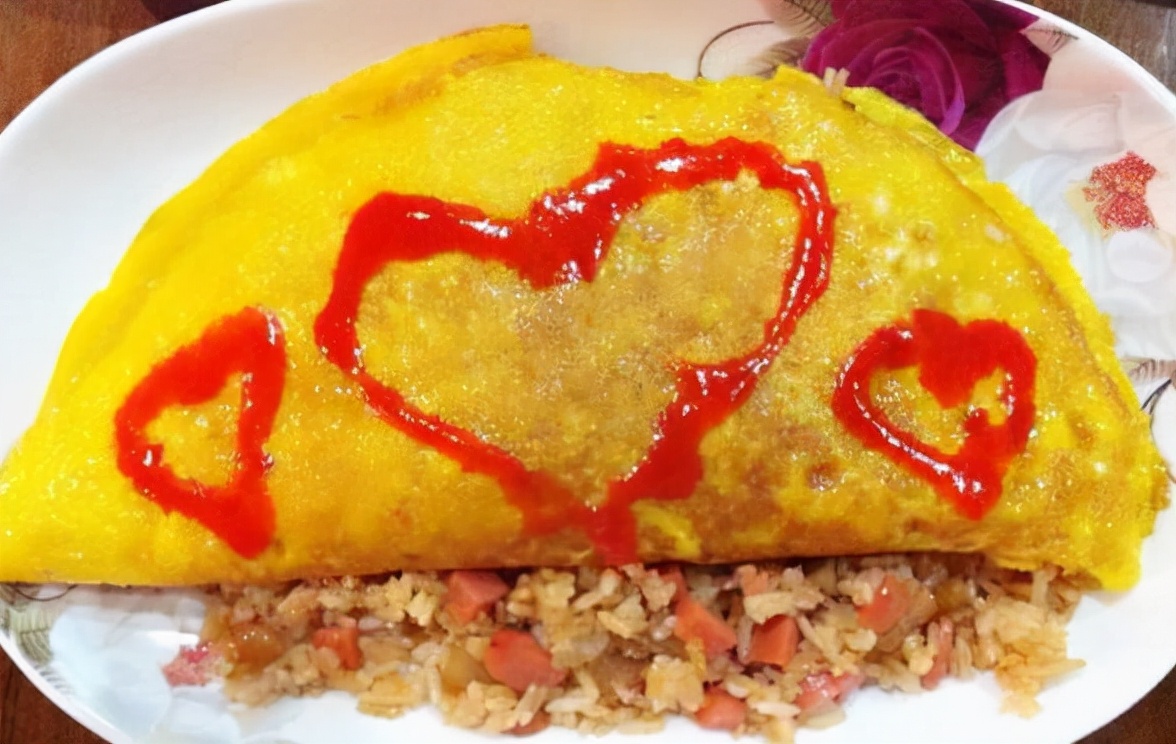 5。煮熟后,把炒饭放到鸡蛋饼的边上,折成一个煎蛋卷,这些菜上有番茄酱,味道很好。