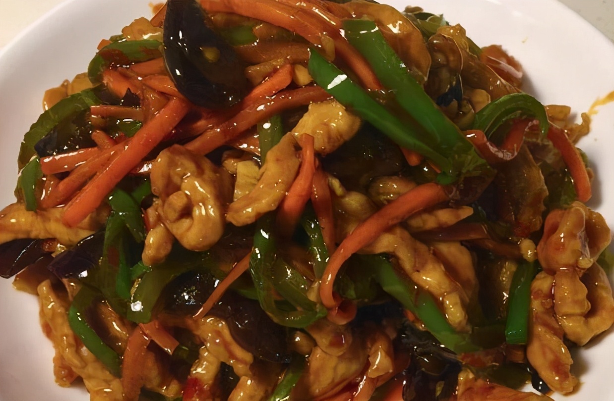 8. 倒入青椒、胡萝卜丝和木耳丝,大火翻炒一会,再倒入肉丝