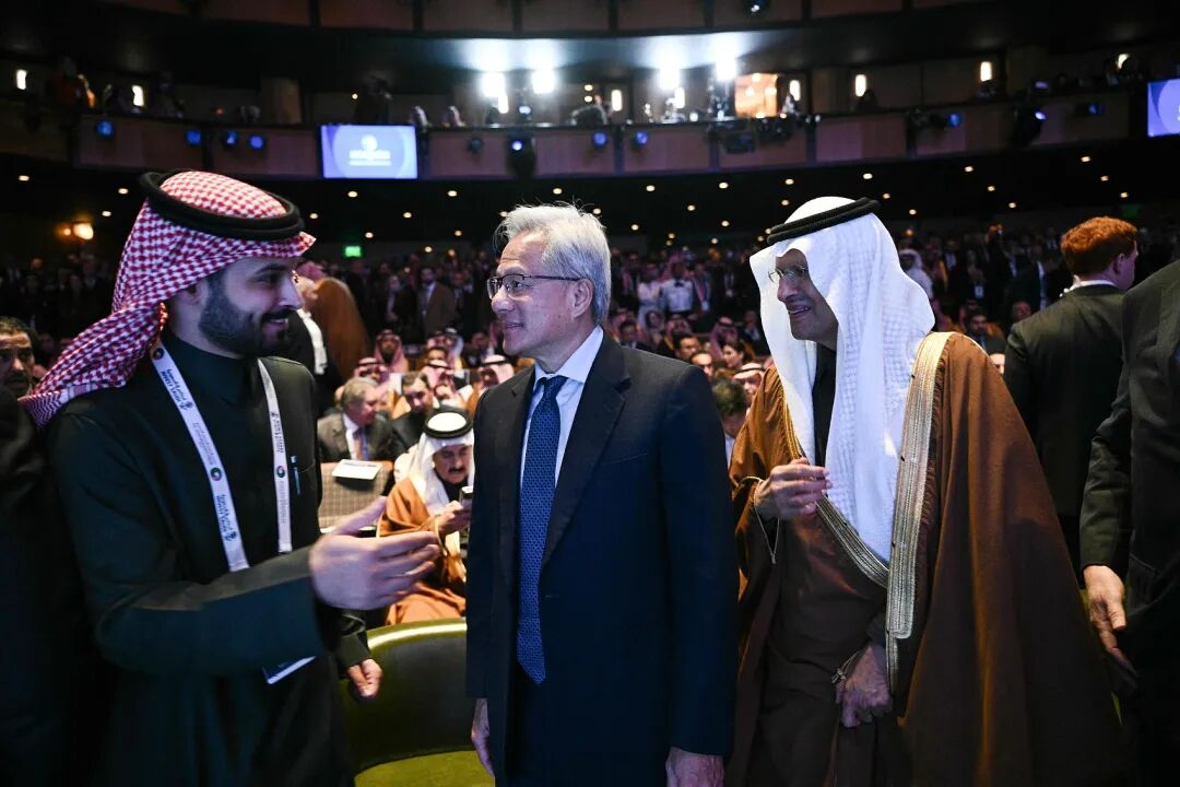 ● 2025年11月19日,黄仁勋(中)在美沙投资论坛上与沙特阿拉伯代表团成员交谈。图源:视觉中国