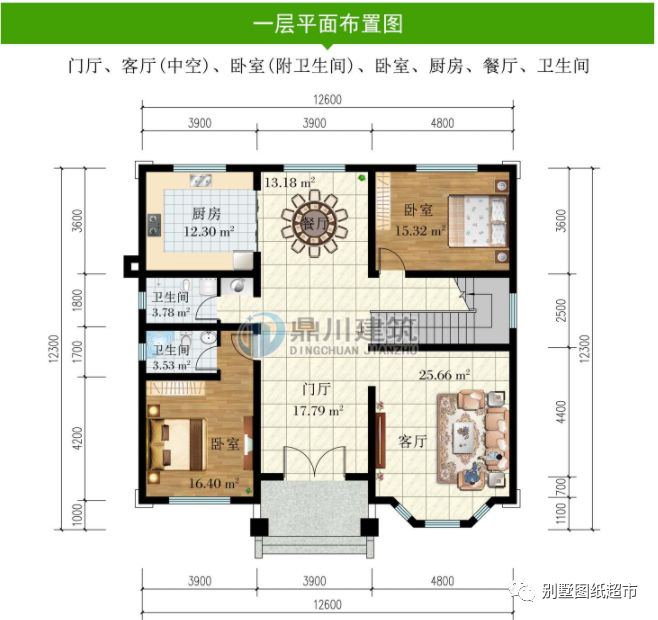 一 层:客厅、卧室(附卫生间)、厨房、餐厅、卫生间
