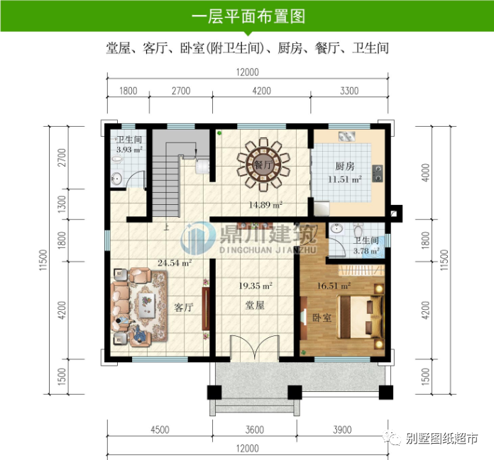 一 层:堂屋、客厅、卧室(附卫生间)、厨房、餐厅、卫生间