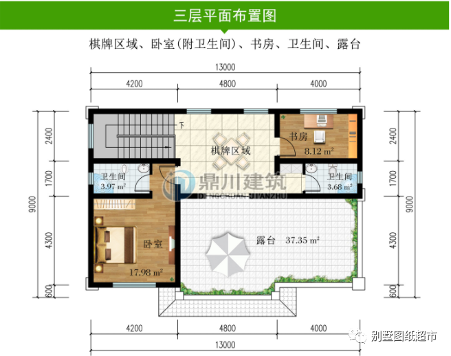 三 层:棋牌区域、卧室(附卫生间)、书房、卫生间、露台