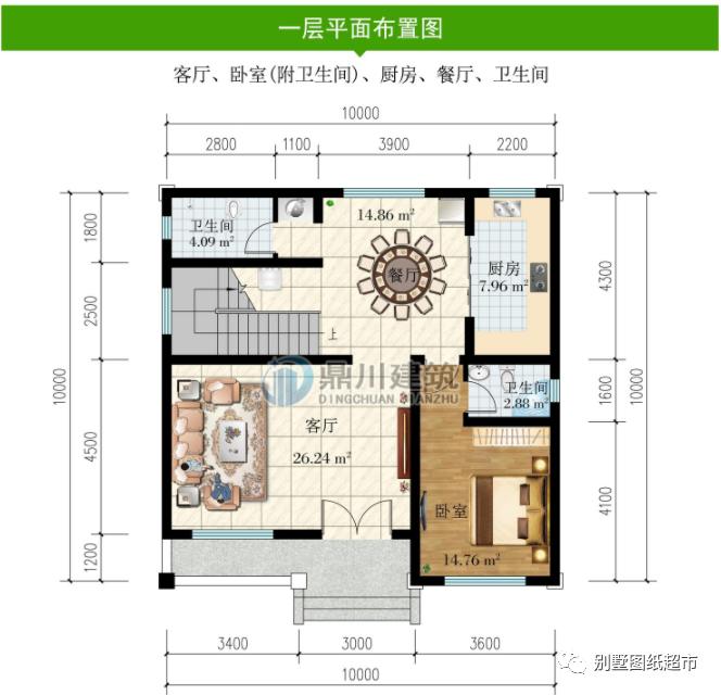 一 层:客厅、卧室(附卫生间)、卧室、厨房、餐厅、卫生间
