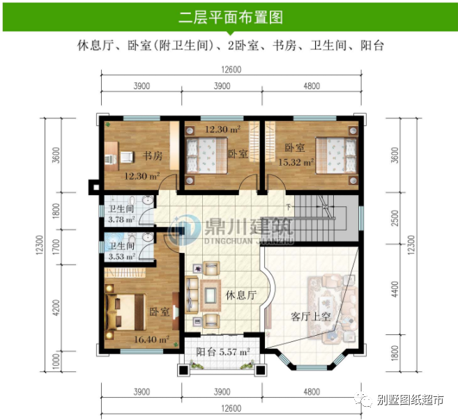 二 层:休息厅、卧室(附卫生间)、2卧室、书房、卫生间、阳台