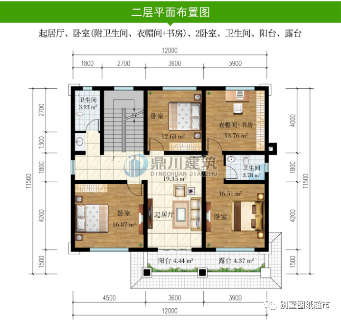 二 层:起居厅、卧室(附卫生间、衣帽间+书房)、2卧室、卫生间、阳台、露台