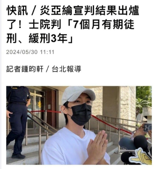 5月30日,据台媒报导,炎亚纶耀乐官司今日一审宣判,台北士林地方法院宣判炎亚纶有期徒刑7个月、缓刑3年,而他的陈姓友人也因为持有影片,同时还下载影片传回给炎,一审判决4个月,但可以易科罚金(罚款代替徒刑)。