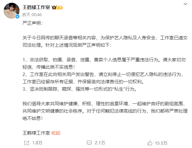 王鹤棣工作室也在凌晨发布严正声明,回应网传录音为不实信息并递交司法处理。