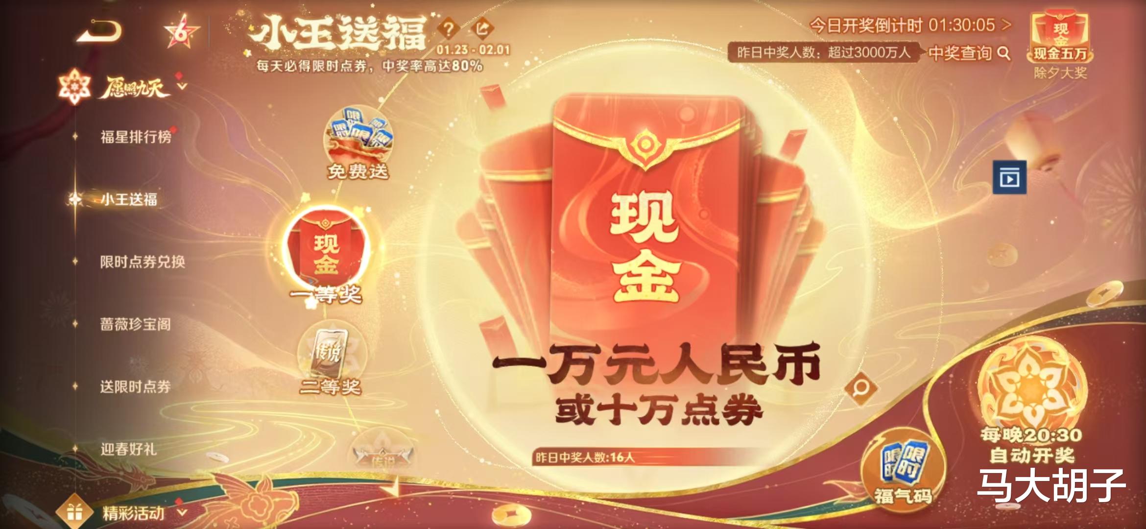 该活动免费参与,每日8.05前,小王会送每个账号一串数字,而后于8.30开奖,该串数字凡中一个即可获奖,根据中奖数字号码多少决定奖品,奖品包括:限时点券、传说皮肤、消费返利、未来一年直售皮肤,以及现金大奖,除夕当晚高达50000。