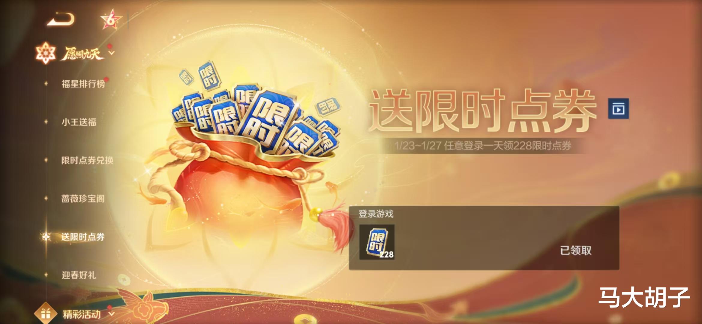 1.23后-2.1期间玩家登陆可领取限时点券,加上除夕当天送的限时点券,以及灵宝市集等可以获得最高达上千的限时点券,利用限时点券可获得英雄敖隐、皮肤地狱火、幻光神枪等,至于能不能免费拿到英雄和皮肤,就要看大家的登陆频率和运气了。