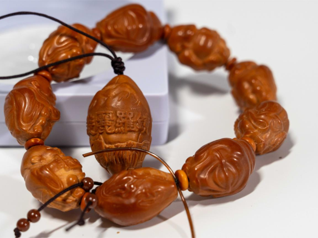 橄榄核雕又称榄雕,是广东地区传统雕刻艺术之一,罗定市罗镜镇当地的榄雕工艺秉承了岭南文化的风格特征,造型秀丽、雅致,线条流畅、动静结合、细腻精微。核雕原料来自罗镜当地种植的核厚质优的上乘乌榄核,经由数控雕刻、人工修饰、打磨抛光、打孔、串珠等工序,而成为挂件、手串、项链等工艺品。