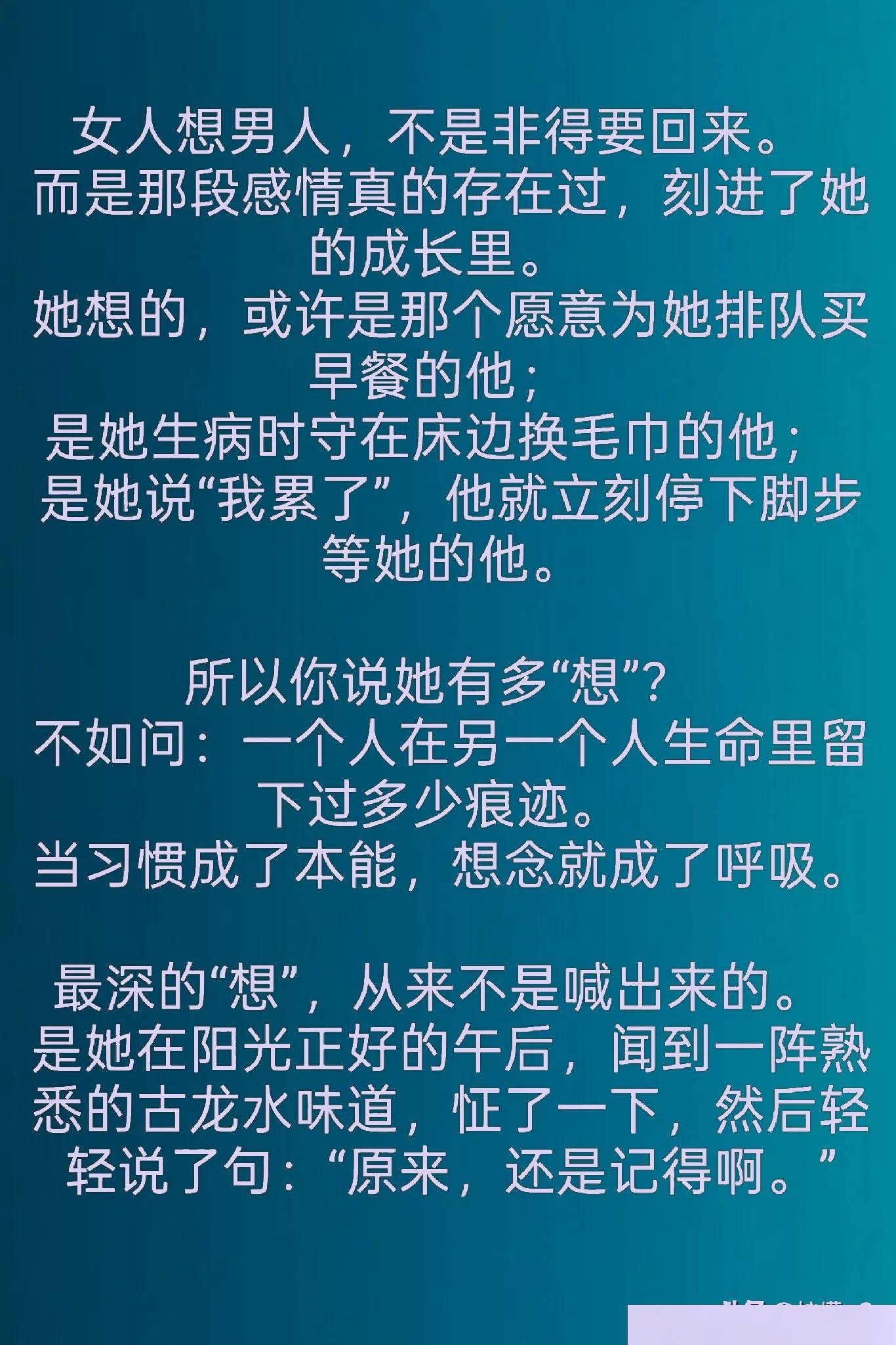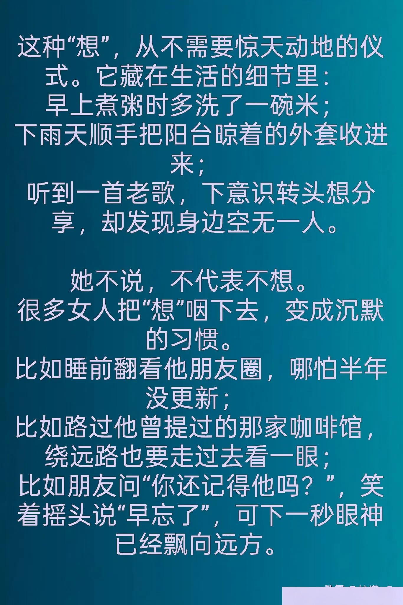 女人的“想”,从来不是挂在嘴边的念念不忘,也不是深夜里翻遍他的朋友圈。而是,在某个寻常的午后,听到一首老歌,或看到一个相似的背影,心里忽然咯噔一下。然后呢?没有然后了。只是在那一刻,她清晰地知道,那段岁月真实存在过,那个奋不顾身爱过的自己也真实存在过。这种“想”,不为重逢,只为和解。它早已化作她骨子里的温柔和铠甲,让她更懂得如何去爱,也更懂得爱自己。