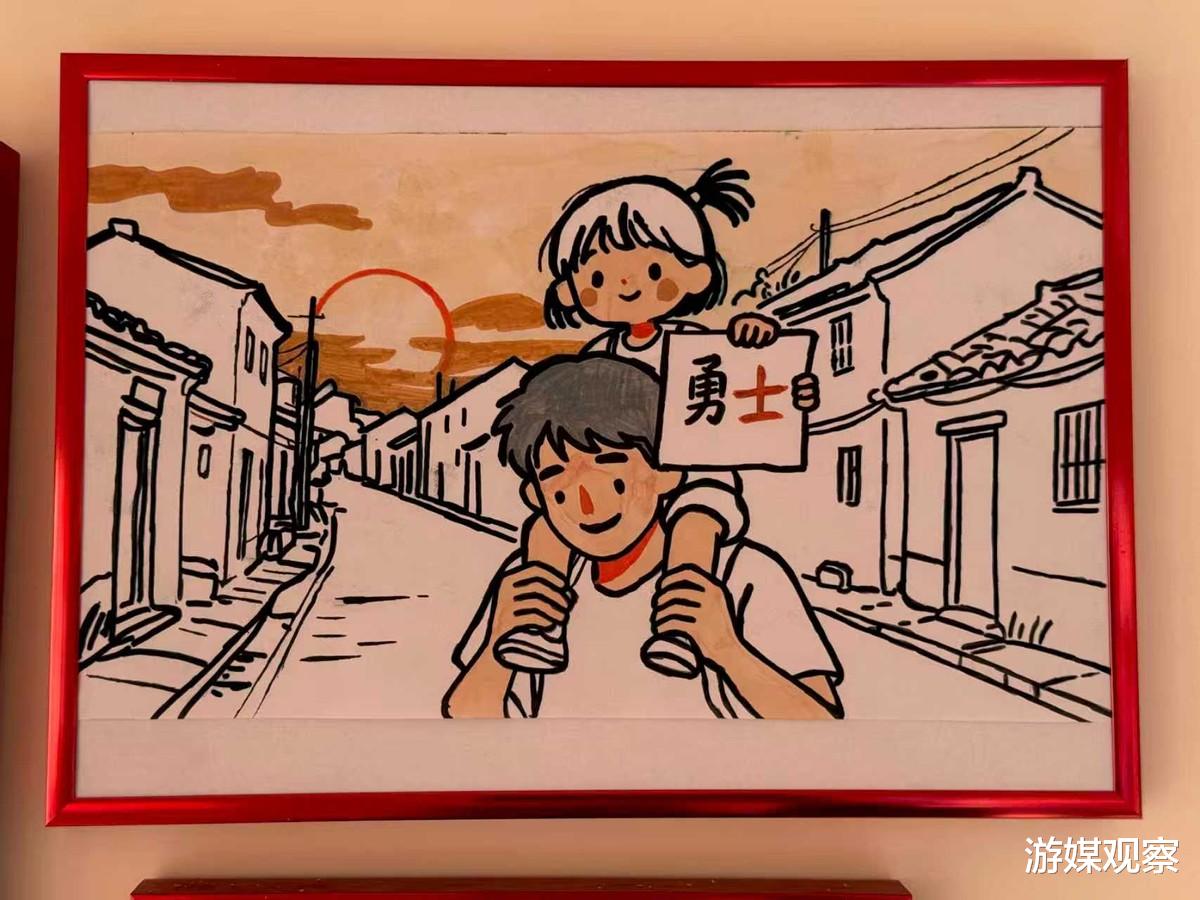 在嘉年华现场,一幅画作格外触动人心——画中,小女孩稳稳坐在大人肩头,高高举起手中写着“勇士”二字的纸片,夕阳西下,身后是温暖的家。这幅来自新疆孩子的作品,让无数玩家驻足,也生动诠释了勇士公益的内涵:真正的勇士,是用善意浇灌每颗童真梦想,是俯身接住期待、让每份微光都被看见的温柔底气。