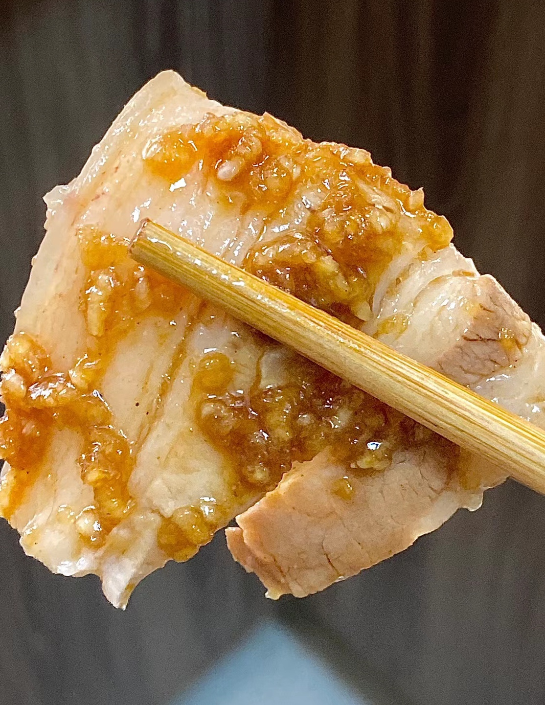 1. **淋酱汁**:将调好的蒜泥酱汁均匀淋在码好的五花肉片上。