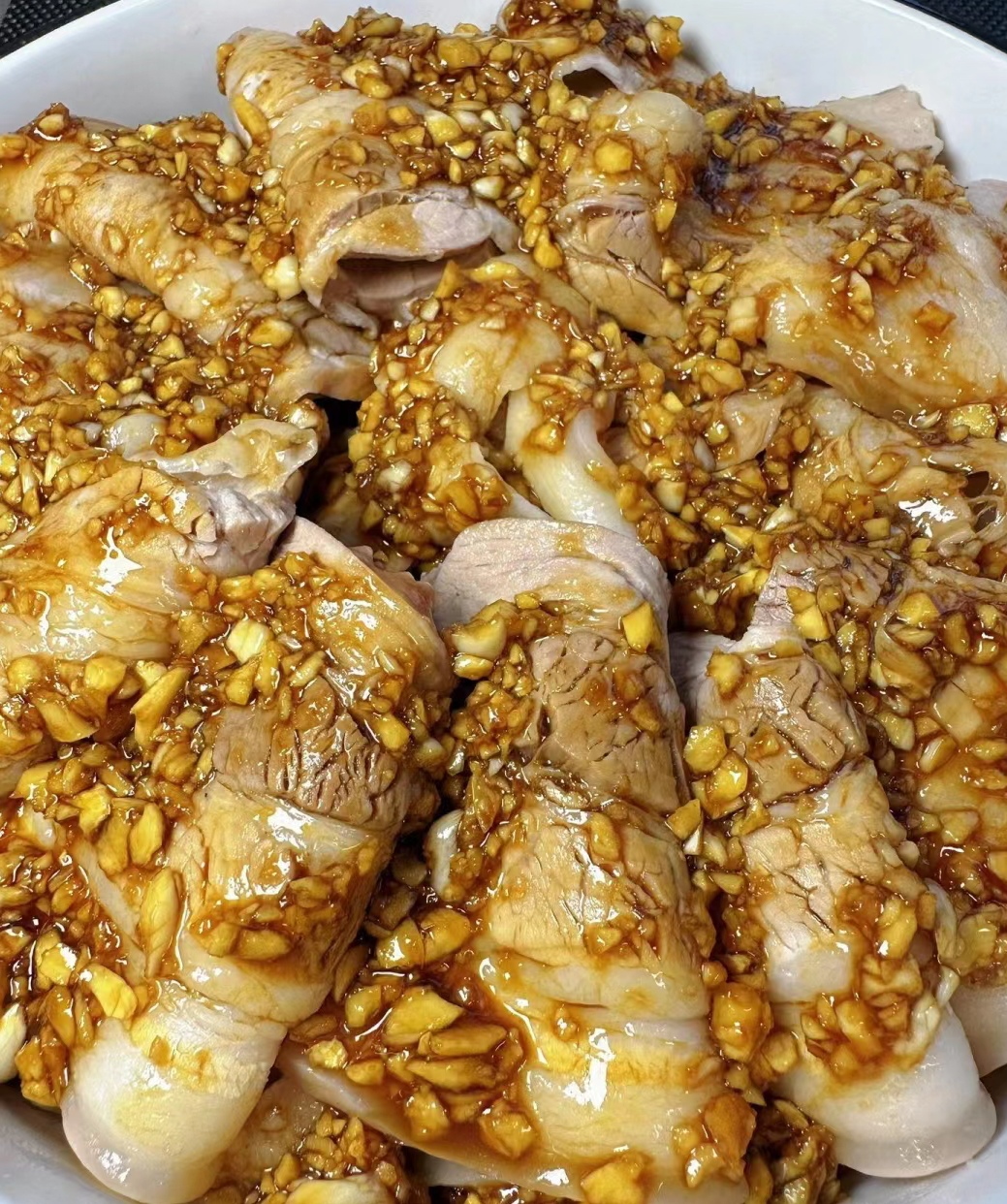 2. **调配酱汁**:将蒜泥、生抽、老抽、花椒粉、麻油、香醋、糖、盐、辣椒油、熟芝麻、花生碎混合均匀,制成蒜泥酱汁。