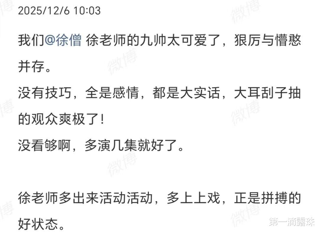 这次,徐僧在《大生意人》中饰演九帅时,动作戏与神态戏均十分传神。徐僧凭借习武底子,掌掴保庆、乔松等戏份时,气场霸道、眼神凌厉、动作利落,将武将的杀伐果决演绎得淋漓尽致,观众称其刚硬气场焊在身上,掌掴同僚的劲儿直接圈粉,以至于呼吁九帅戏份加码,徐僧值得更多的剧。