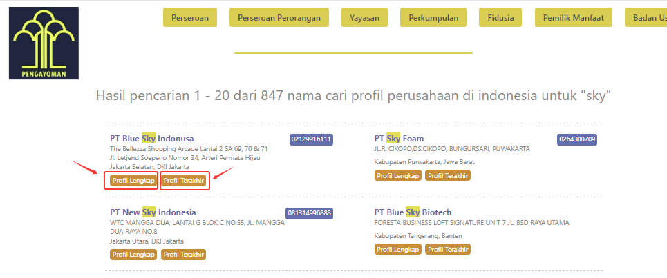 这时候可以看到2个报告版本,分别是Profil Lengkap(历史版)和Profil Terakhir(当前版),前者是包含历史记录的完整信息,价格高很多;后者只包含当前最新信息,价格较便宜。